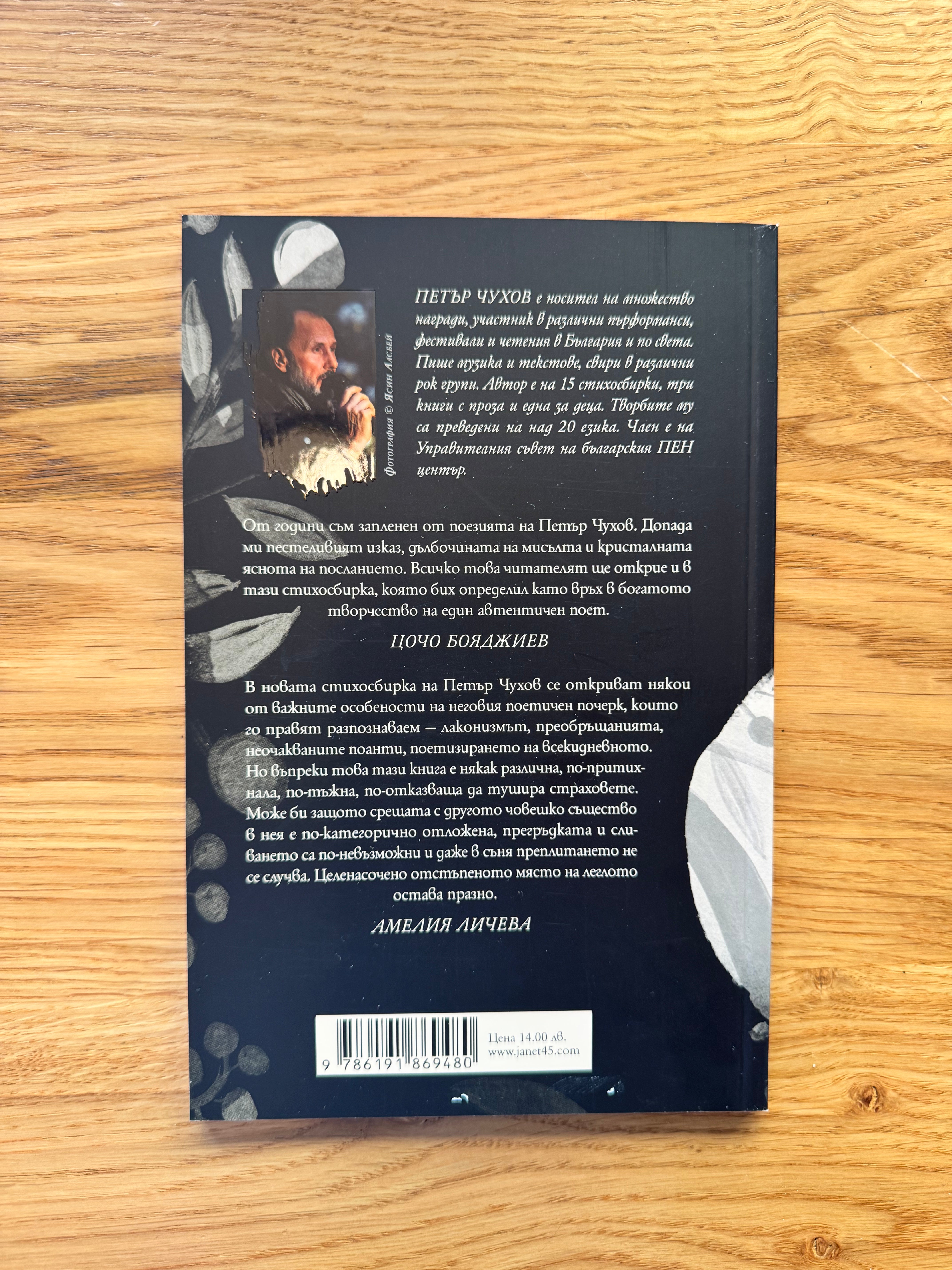 От години съм запленен от поезията на Петър Чухов. Допада ми пестеливият изказ, дълбочината на мисълта и кристалната яснота на посланието. Всичко това читателят ще открие и в тази стихосбирка, която бих определил като връх в богатото творчество на един автентичен поет.